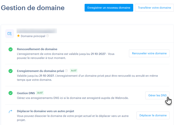 2. Cliquez sur le bouton Gérer le DNS à côté du domaine souhaité.