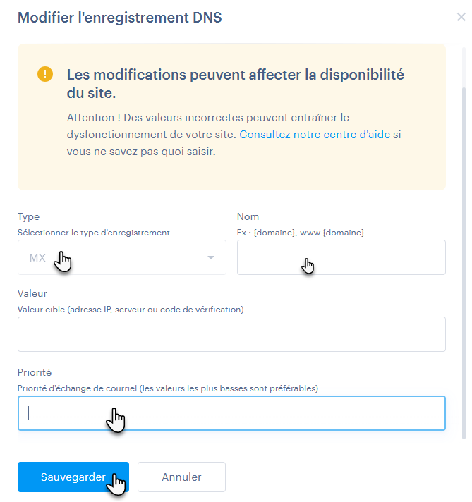 Certains prestataires peuvent vous fournir plusieurs enregistrements MX. Chaque enregistrement MX inclut une valeur numérique appelée priorité — elle détermine l'ordre de tentative de remise des e-mails par les serveurs. Un nombre inférieur signifie une priorité supérieure, ainsi le serveur avec la valeur la plus basse sera contacté en premier. Si ce serveur n'est pas disponible, le système essaiera le prochain avec une priorité supérieure.