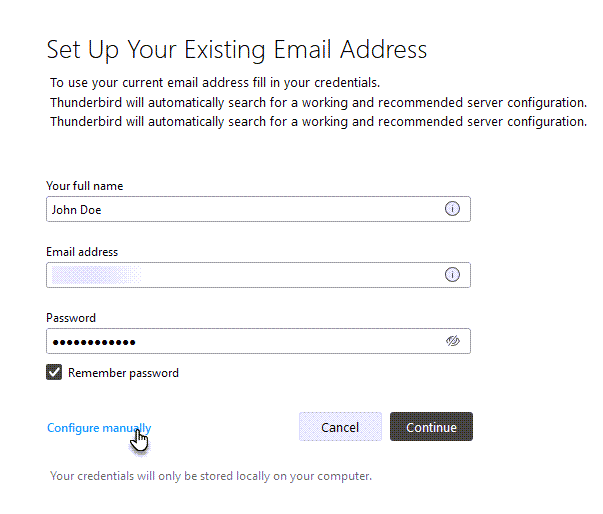 4. Add meg a nevedet (ezt látják a címzettek, amikor e-mailt küldesz), a Webnode-ban létrehozott e-mail címedet, az e-mail címhez tartozó jelszót. Ezután kattints a Manuális beállítás gombra.