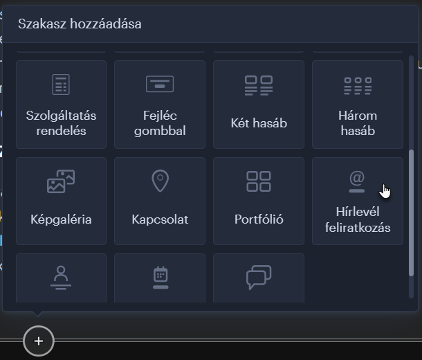 A Webnode szerkesztőben hozzáadhatsz egy szekciót kapcsolatfelvételi űrlappal, amely előre be van állítva e-mail címek gyűjtésére. Egyszerűen csak adj hozzá egy Hírlevél szekciót.