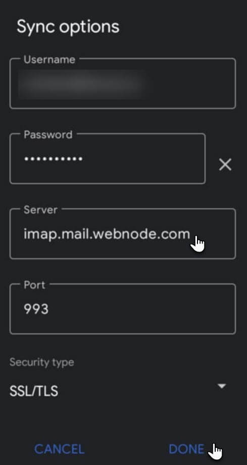 6. A Bejövő beállítások részben módosítsd a szervert imap.mail.webnode.com-ra.