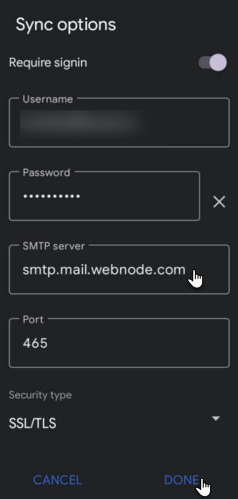 7. A kimenő beállítások részben módosítsd a szervert smtp.mail.webnode.com-ra.