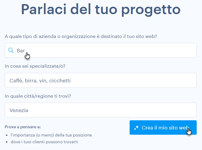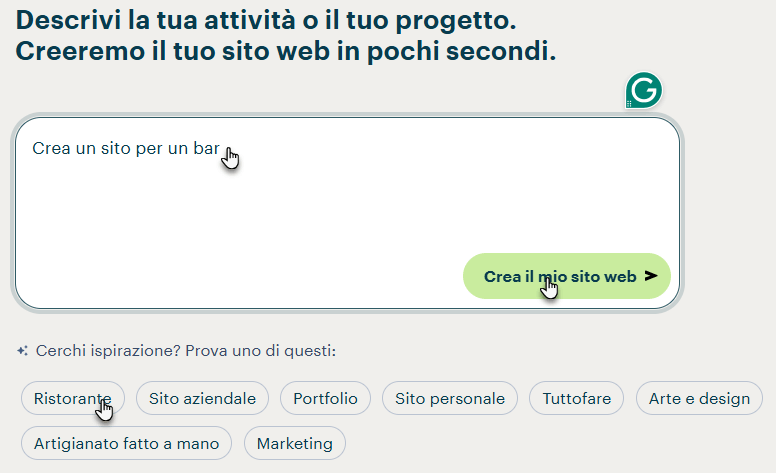 2. Descrivi che tipo di sito desideri creare oppure scegli una delle categorie suggerite, quindi clicca su Crea il mio sito web.