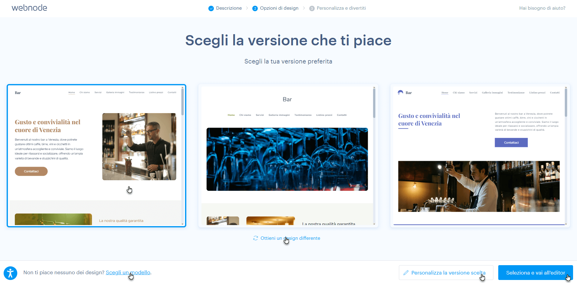 5. Qui puoi scegliere uno dei design generati dall’intelligenza artificiale e personalizzarlo tramite il pulsante Personalizza la versione scelta. Puoi anche generare nuovi design utilizzando il pulsante Ottieni un design differente (potrai comunque tornare ai design precedentemente selezionati). Se invece preferisci scegliere uno dei modelli Webnode, clicca su Scegli un modello.