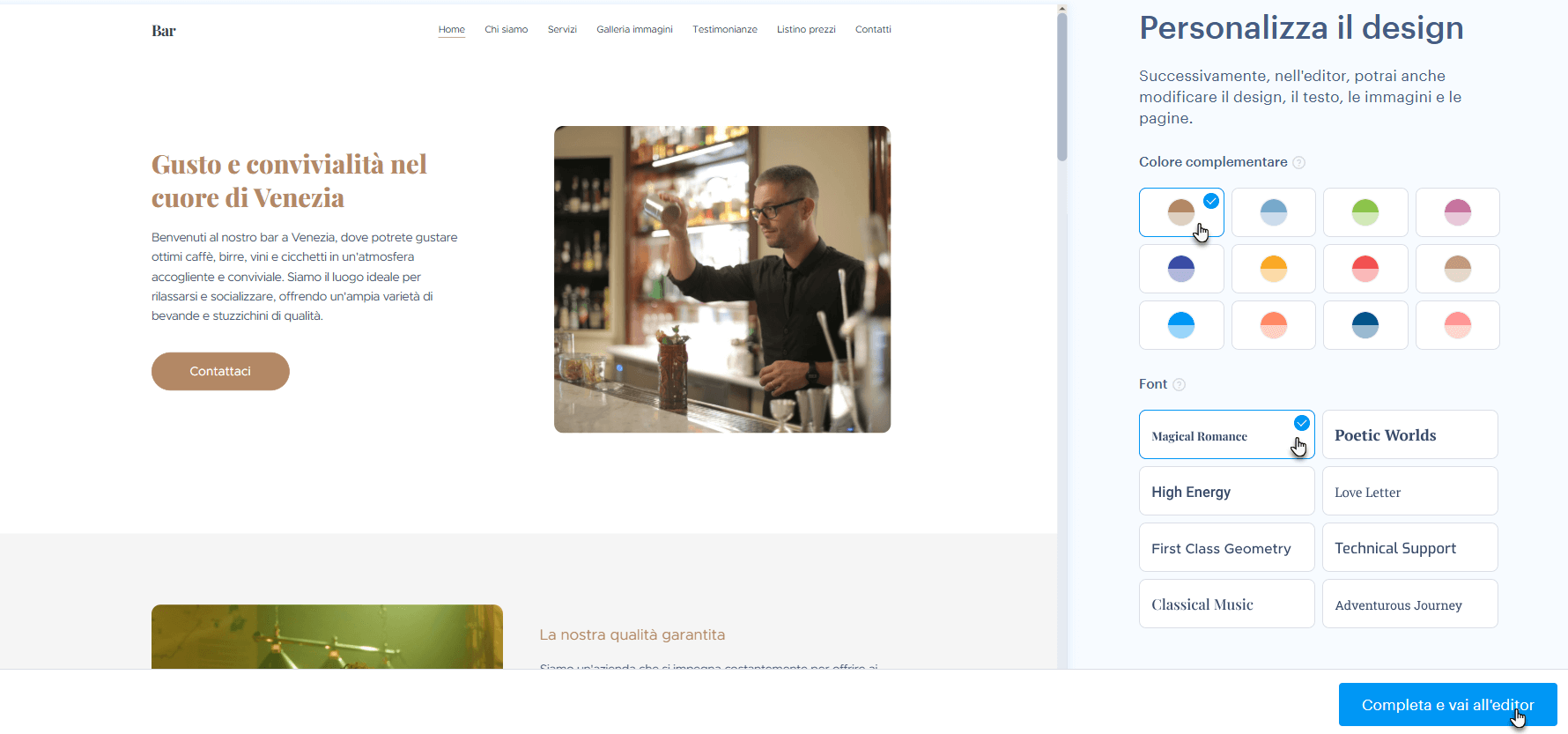 6. Durante la personalizzazione dei design generati, puoi selezionare il colore del sito e il carattere (font) utilizzato nelle pagine.