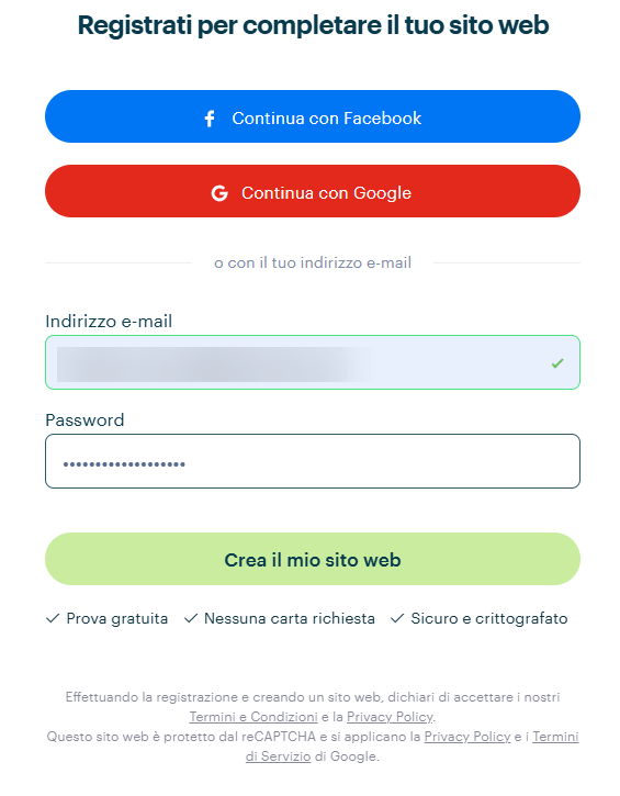 3. Registra il tuo account oppure, se possiedi già un account, inserisci le tue credenziali di accesso. Clicca sul pulsante Crea il mio sito web.