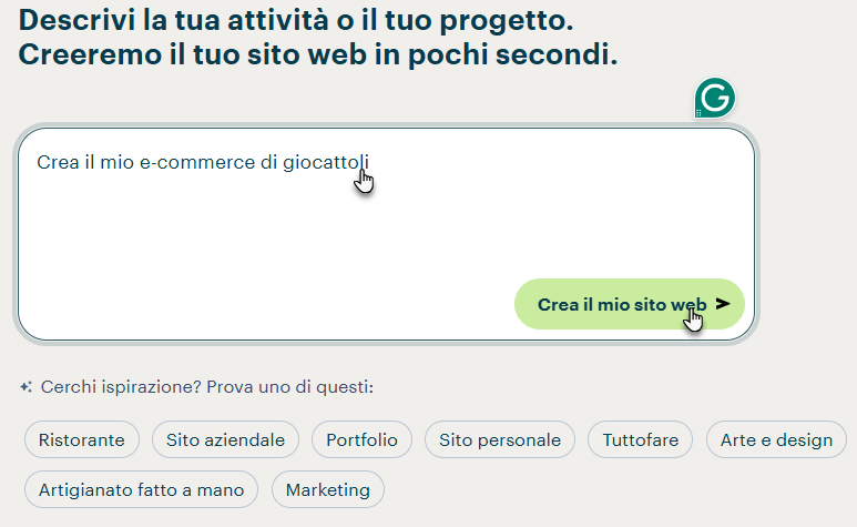 2. Descrivi che tipo di sito desideri creare oppure scegli una delle categorie suggerite, quindi clicca su Crea il mio sito web.