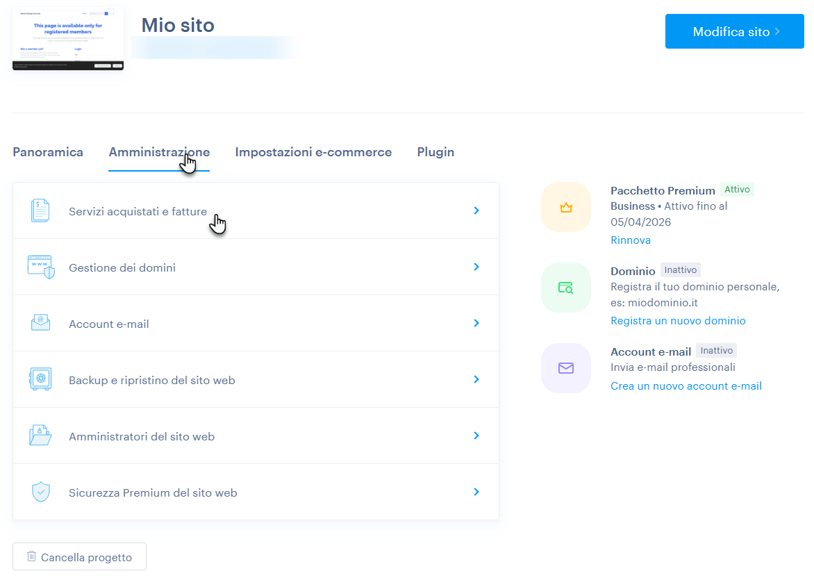 1. Nell’amministrazione del progetto, clicca sulla scheda Amministrazione e poi seleziona Servizi acquistati e fatture.