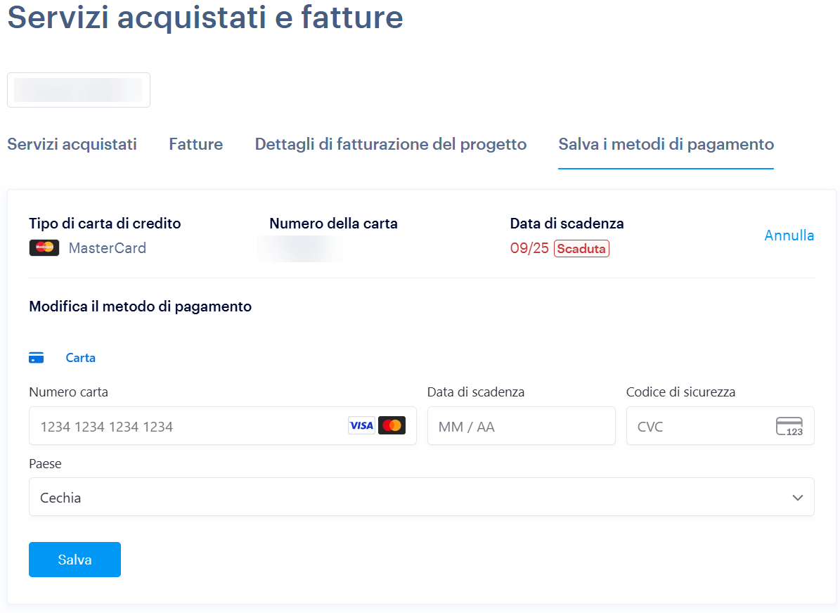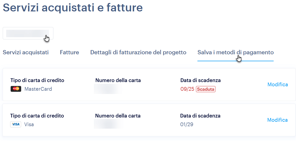 In questa guida imparerai come modificare i metodi di pagamento salvati (carte di pagamento). Una carta di pagamento deve essere aggiornata separatamente per ogni progetto, anche se è stata utilizzata su più progetti. Se cambi la carta, questa verrà aggiornata per tutti i gli abbonamenti di quel progetto che sono stati pagati con la carta indicata. Una carta può essere cambiata solo se nel progetto è attivo un rinnovo automatico.