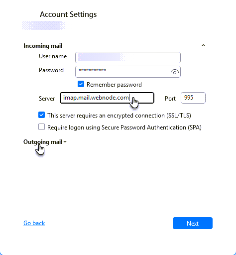 5. Nel campo Server modifica il valore in imap.mail.webnode.com, poi fai clic su Outgoing mail.