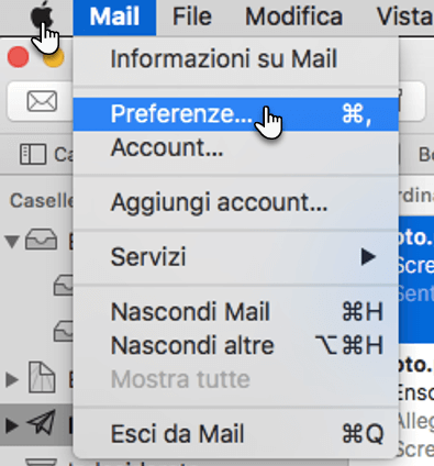 1. Apri l’app Mail. Nell’angolo in alto a sinistra, fai clic su Mail e poi su Preferenze...