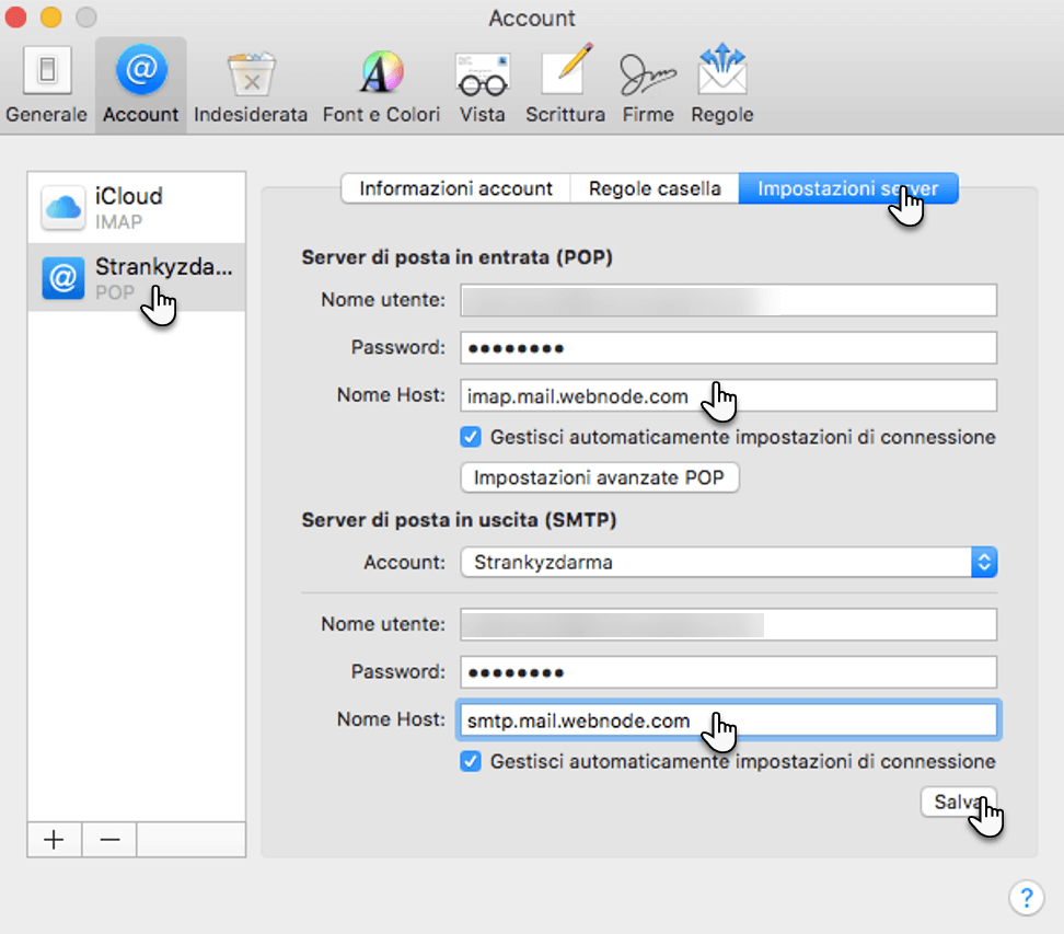 2. Seleziona lo specifico account, fai clic su Impostazioni server e modifica il campo Server di posta in entrata - Nome Host in imap.mail.webnode.com e il campo Server di posta in uscita - Nome Host in smtp.mail.webnode.com.