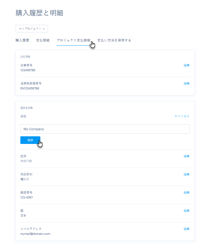 明細情報は、プロジェクト管理画面で直接変更するか、ドメインまたはプレミアムプランの新規購入時に変更できます。もし、自動更新が有効化になっている場合は、はじめに自動更新を無効化に設定した後、正しい明細情報を新規購入時に作成する必要があります。サブスクリプションに関しての情報は『自動更新って?』のページをご参照ください。