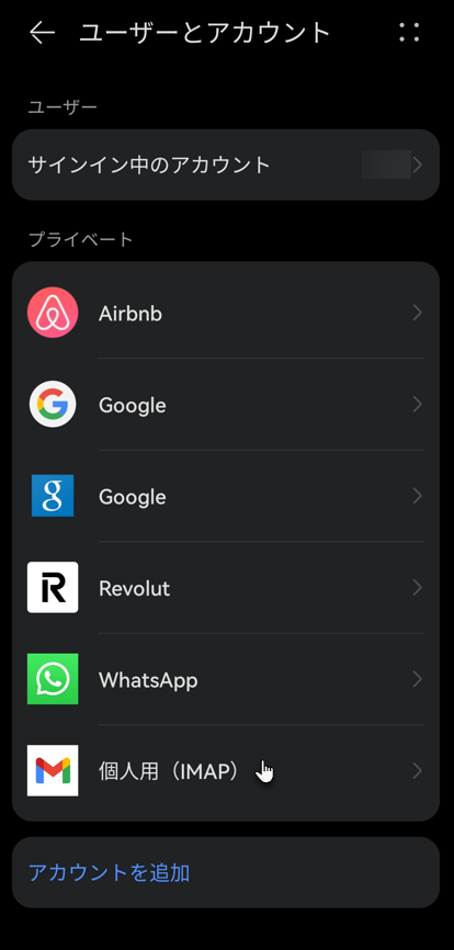 1. 携帯電話で設定を開き、ユーザーとアカウントを選択します。(※使用しているバージョンや機器によっても表示されている名前が違う場合があります。例:パスワードとアカウント 等)