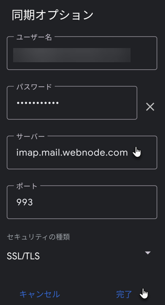 5. 受信設定のサーバーを imap.mail.webnode.com に変更します。