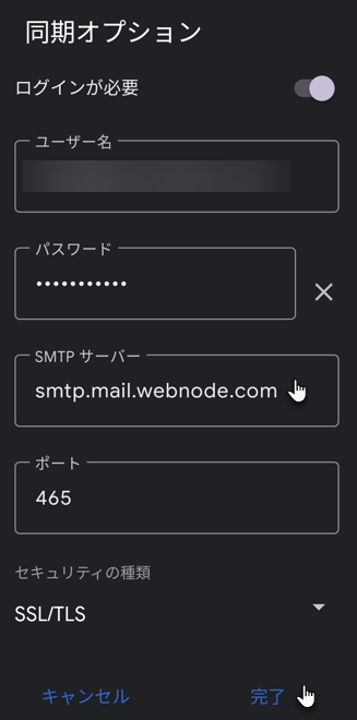 6. 送信設定のサーバーを smtp.mail.webnode.com に変更します。