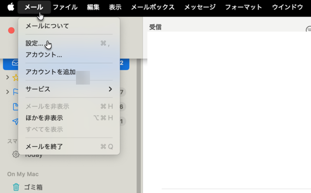 1. メールアプリを開きます。左上のメールをクリックし、設定を選択します。