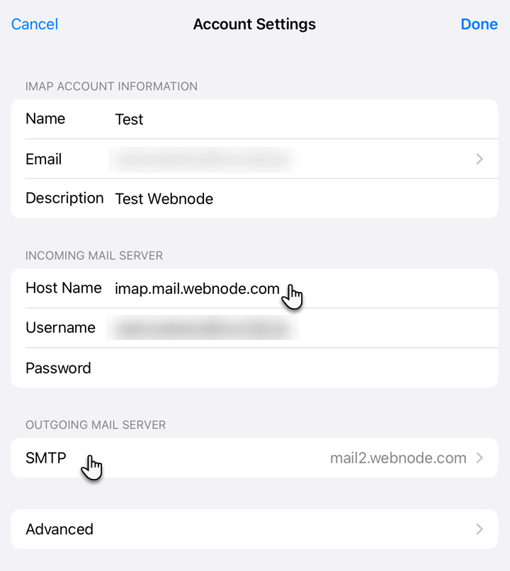 Å oppdatere innstillingene er enkelt. Du trenger bare å endre to verdier: innkommende og utgående server. Bytt ut de gamle serverne (mail1.webnode.com, mail2.webnode.com eller mail3.webnode.com) med de nye: imap.mail.webnode.com (innkommende) og smtp.mail.webnode.com (utgående). Alle andre innstillinger i e-postklienten forblir de samme.