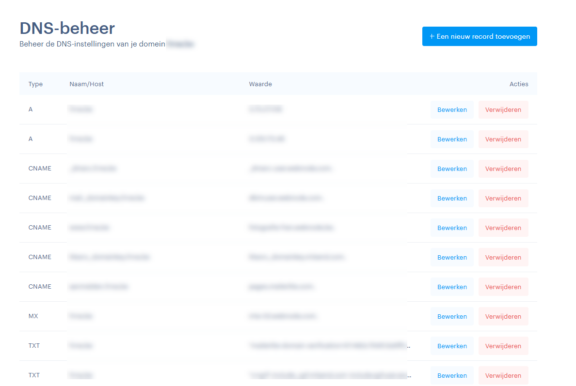Als je andere soorten records wilt wijzigen die niet in het beheer worden weergegeven, of als je een nieuw subdomein wilt aanmaken vanuit je eigen domein (bijvoorbeeld shop.uwdomein.com), neem dan contact op met onze klantenservice.