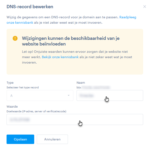 Wanneer je een bestaand record bewerkt, kun je het type niet wijzigen. Alleen de naam en de waarde kunnen worden aangepast.