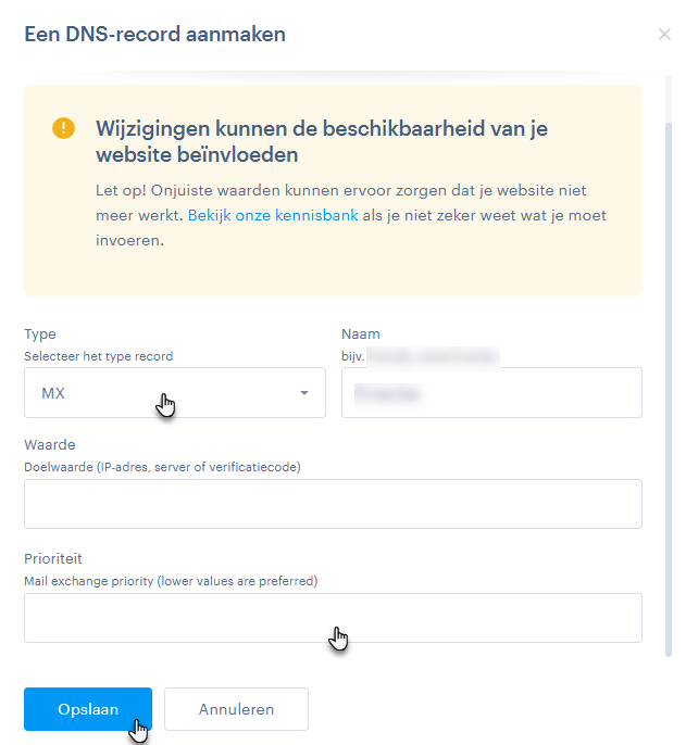 Hier kun je het recordtype selecteren en de naam en waarde invoeren. Voor MX-records kun je daarnaast ook de prioriteit instellen.