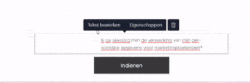 Dit veld is bedoeld om toestemming van de gebruiker te vragen voor het verwerken van persoonlijke gegevens. Er kan slechts één selectievakje worden toegevoegd. De tekst kan vet of cursief worden weergegeven en er kan een link worden toegevoegd, bijvoorbeeld naar een pagina met informatie over de bescherming van persoonsgegevens.