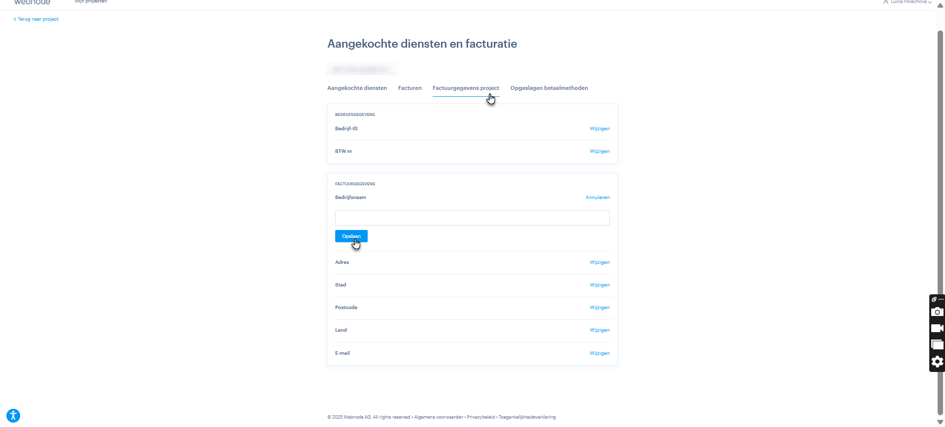 Je kunt de factuurgegevens rechtstreeks in de administratie van je project aanpassen of tijdens het plaatsen van een nieuwe bestelling, voor zowel domeinen als Premium pakketten.