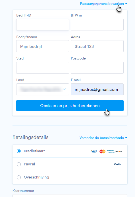 Tip: Wil je de betaalmethode wijzigen? Volg de instructies uit het artikel Hoe kan ik opgeslagen betaalmethoden wijzigen.