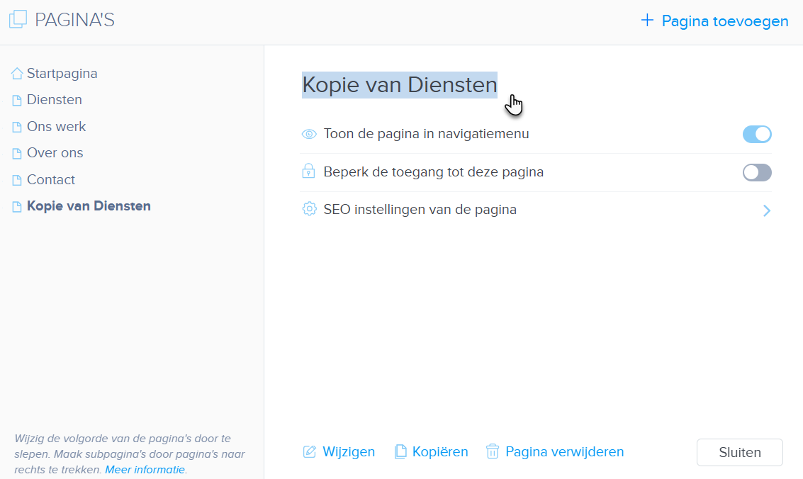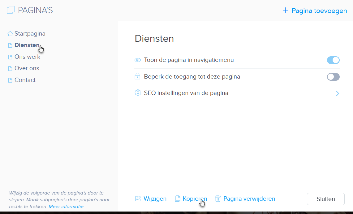 In deze handleiding leer je hoe je een kopie van een individuele pagina op je website kunt maken. Wanneer je een pagina kopieert, worden de inhoud en ontwerp van de oorpsronkelijke pagina gedupliceerd. je kunt elke pagina van je website kopiëren behalve systeempagina´s (zoals login, registratie, enzovoort) en de startpagina.