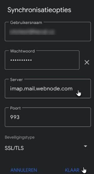 6. In Instellingen inkomende e-mail wijzig de server naar imap.mail.webnode.com.
