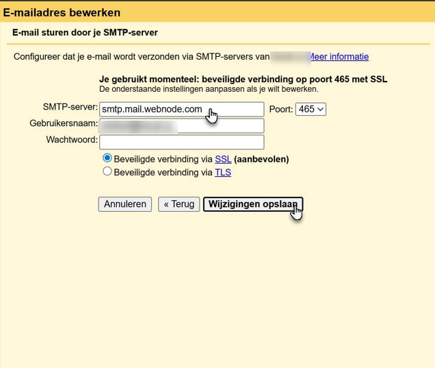 4. Vul in het veld SMTP-server smtp.mail.webnode.com in en bevestig door op Wijzigingen opslaan te klikken.