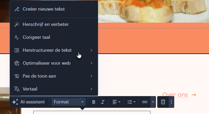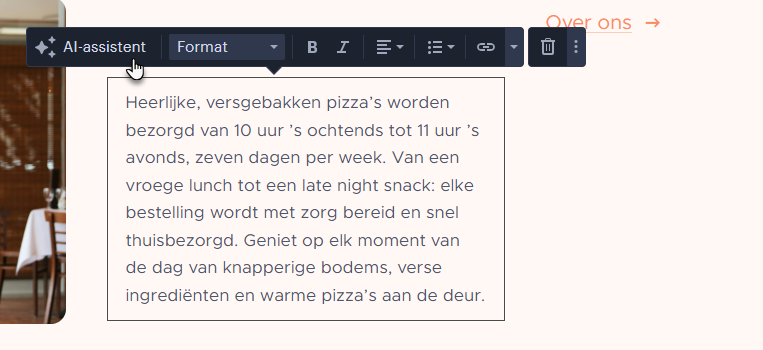1. Klik in de editor op een tekstvak en kies de optie AI‑assistent. In onze handleiding Hoe maak je een tekst met de AI‑assistent vind je meer informatie over het genereren van nieuwe teksten met kunstmatige intelligentie.