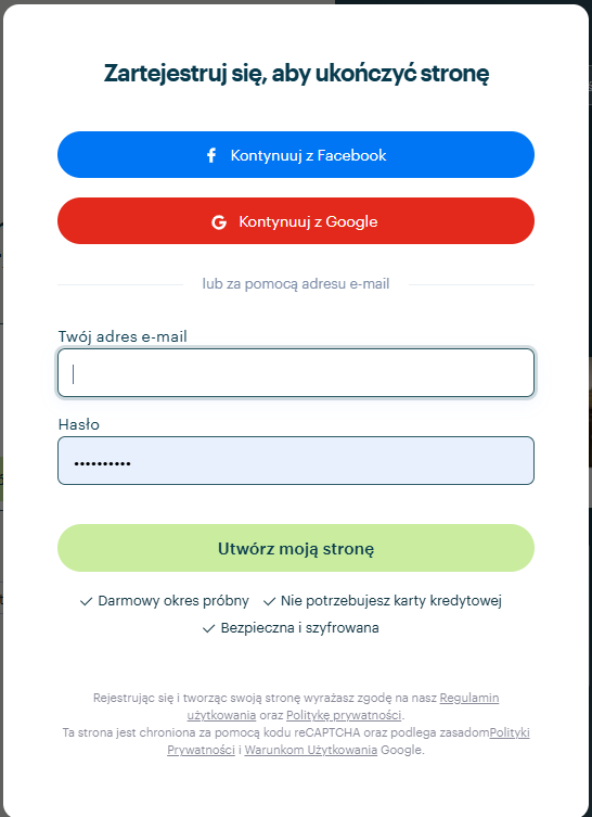 3. Zarejestruj swoje konto. Jeżeli posiadasz już własne konto, wprowadź swoje dane logowania. Kliknij przycisk Utwórz moją stronę.