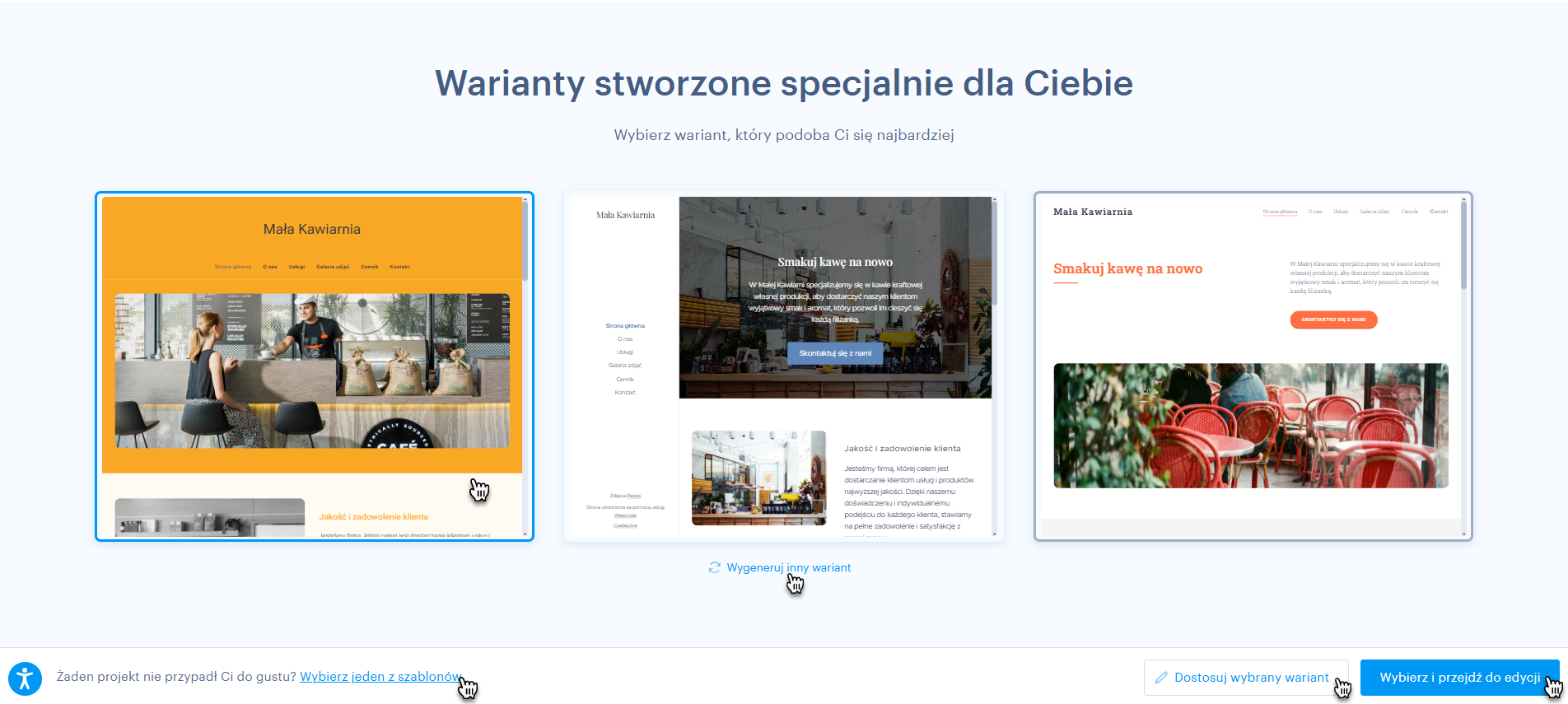 5. W tym miejscu możesz wybrać jeden z szablonów utworzonych przez sztuczną inteligencję, a potem dostosować go do swoich potrzeb za pomocą przycisku Dostosuj wybrany wariant. Możesz również stworzyć nowe szablony za pomocą przycisku Wygeneruj inny wariant (możesz potem powrócić do poprzednio wybranych szablonów). Jeśli chcesz użyć jednego z naszych szablonów, kliknij przycisk Wybierz i przejdź do edycji.