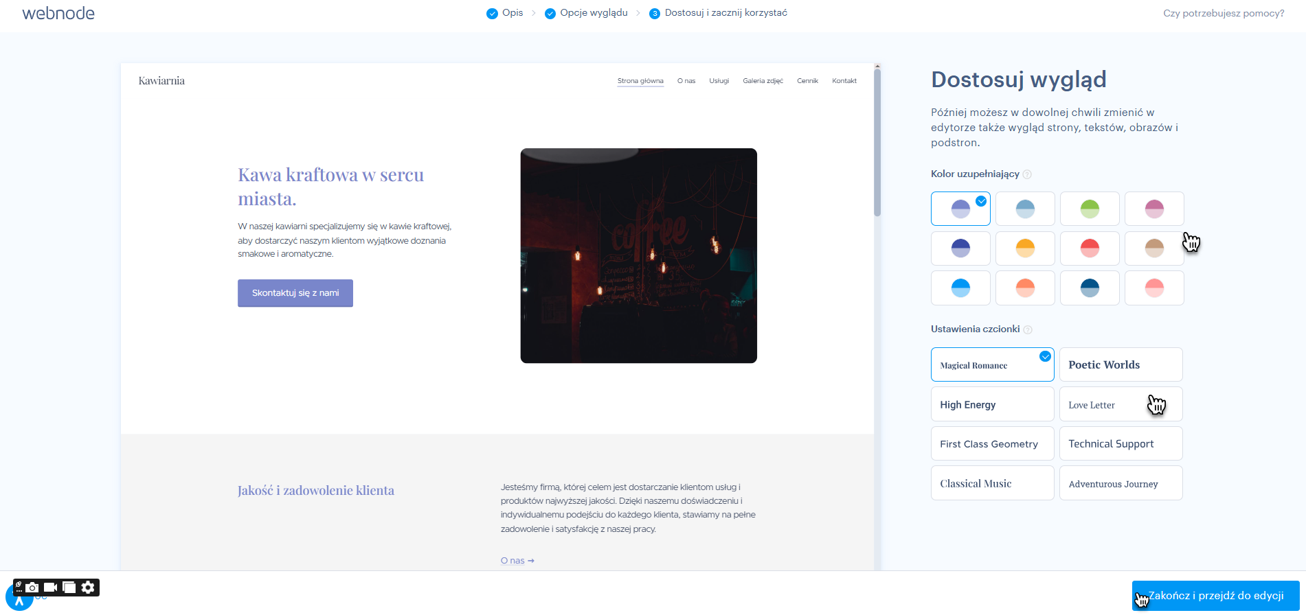 6. W czasie dostosowywania wygenerowanych szablonów możesz wybrać kolorystykę strony oraz użytą na niej czcionkę.