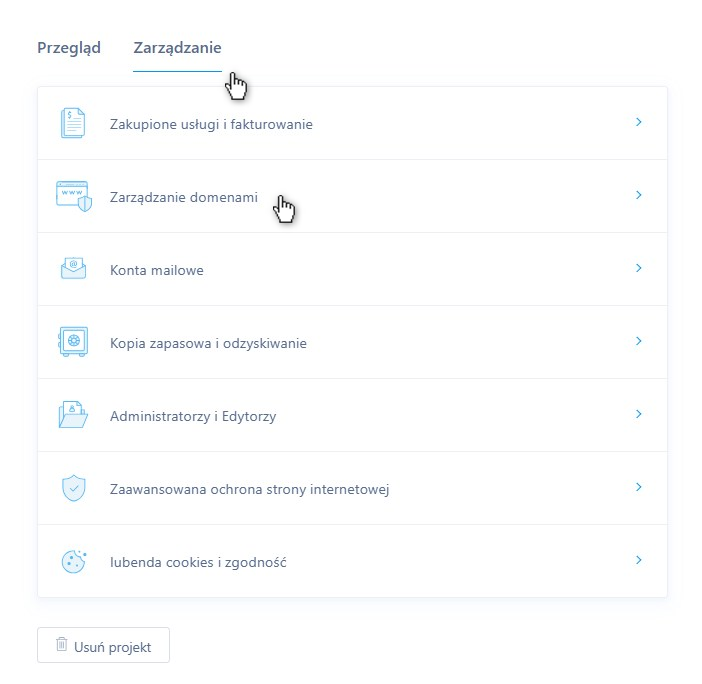 1. Wejdź w panel zarządzania swojego projektu, otwórz zakładkę Zarządzanie, a potem wybierz sekcję Zarządzanie domenami.