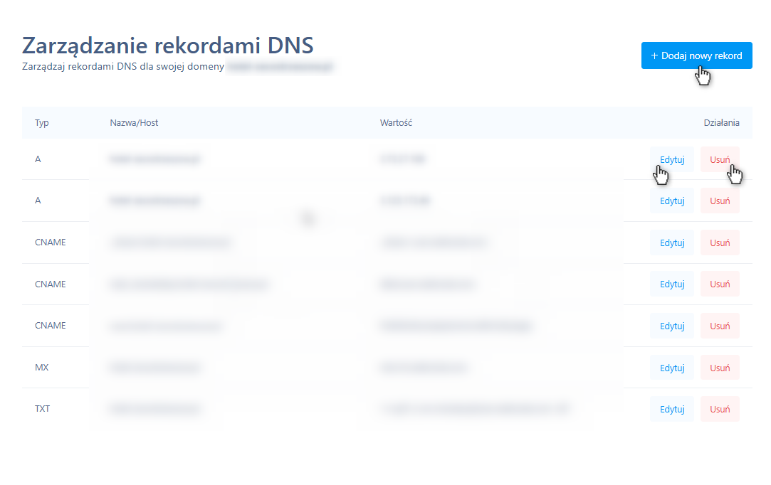 UWAGA: Modyfikowanie już istniejących rekordów DNS może wpłynąć na działanie całej strony. Podanie nieprawidłowych wartości może spowodować, że strona przestanie działać. Zdecydowanie sugerujemy, aby wprowadzać modyfikacje ustawień wyłącznie posiadając duże doświadczenie w takich działaniach, ponieważ w sytuacji zastosowania nieprawidłowej konfiguracji Webnode nie może zagwarantować prawidłowego działania strony.