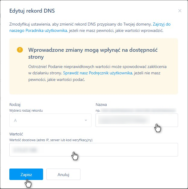 Edytowanie już istniejącego rekordu nie obejmuje możliwości zmiany rodzaju wybranego rekordu - możesz zmodyfikować wyłącznie nazwę i wartość danego rekordu.