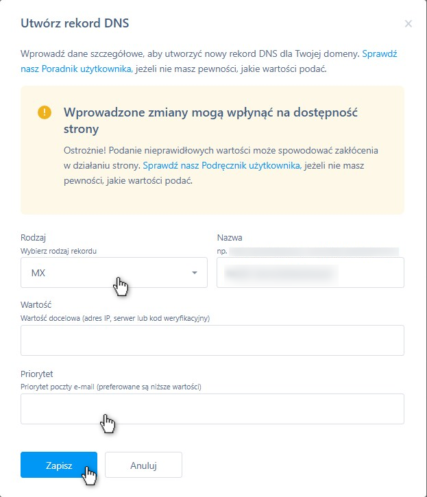 W tym miejscu możesz wybrać rodzaj rekordu, podać jego nazwę oraz wartość. W przypadku rekordów MX, możesz również określić ich priorytet.