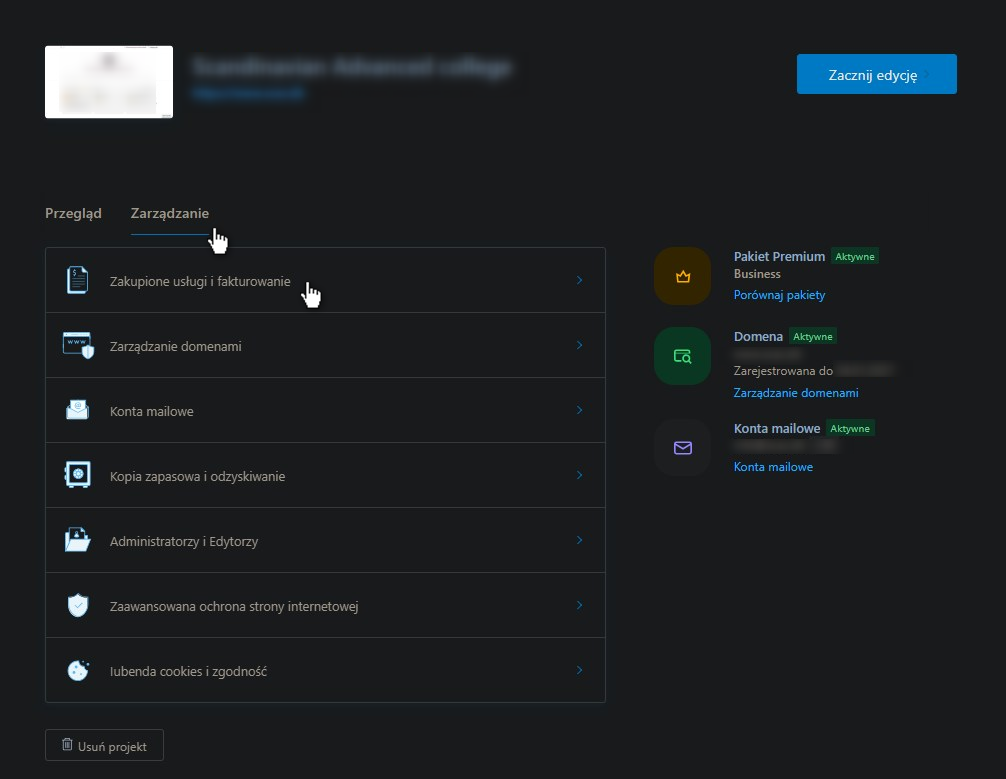 1. Wejdź do panelu zarządzania projektu, kliknij w zakładkę Zarządzanie i wybierz pozycję Zakupione usługi i fakturowanie.
