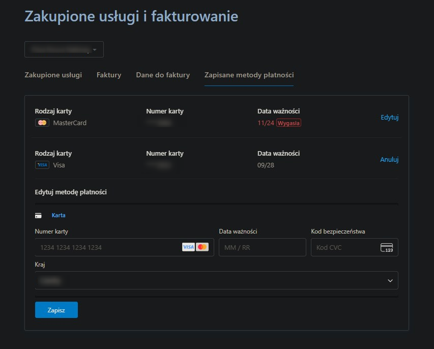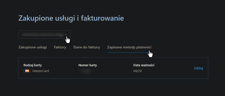 Nawet jeżeli dana karta jest wykorzystywana do zakupu wielu różnych subskrypcji w ramach wybranego projektu, będzie tutaj wymieniona tylko raz. Na liście będą widoczne wyłącznie karty powiązane z aktywnymi subskrypcjami. Wygasłe karty są podświetlone na czerwono. Możesz zamienić dowolną kartę pokazaną na liście (zarówno aktywną, jak i wygasłą).