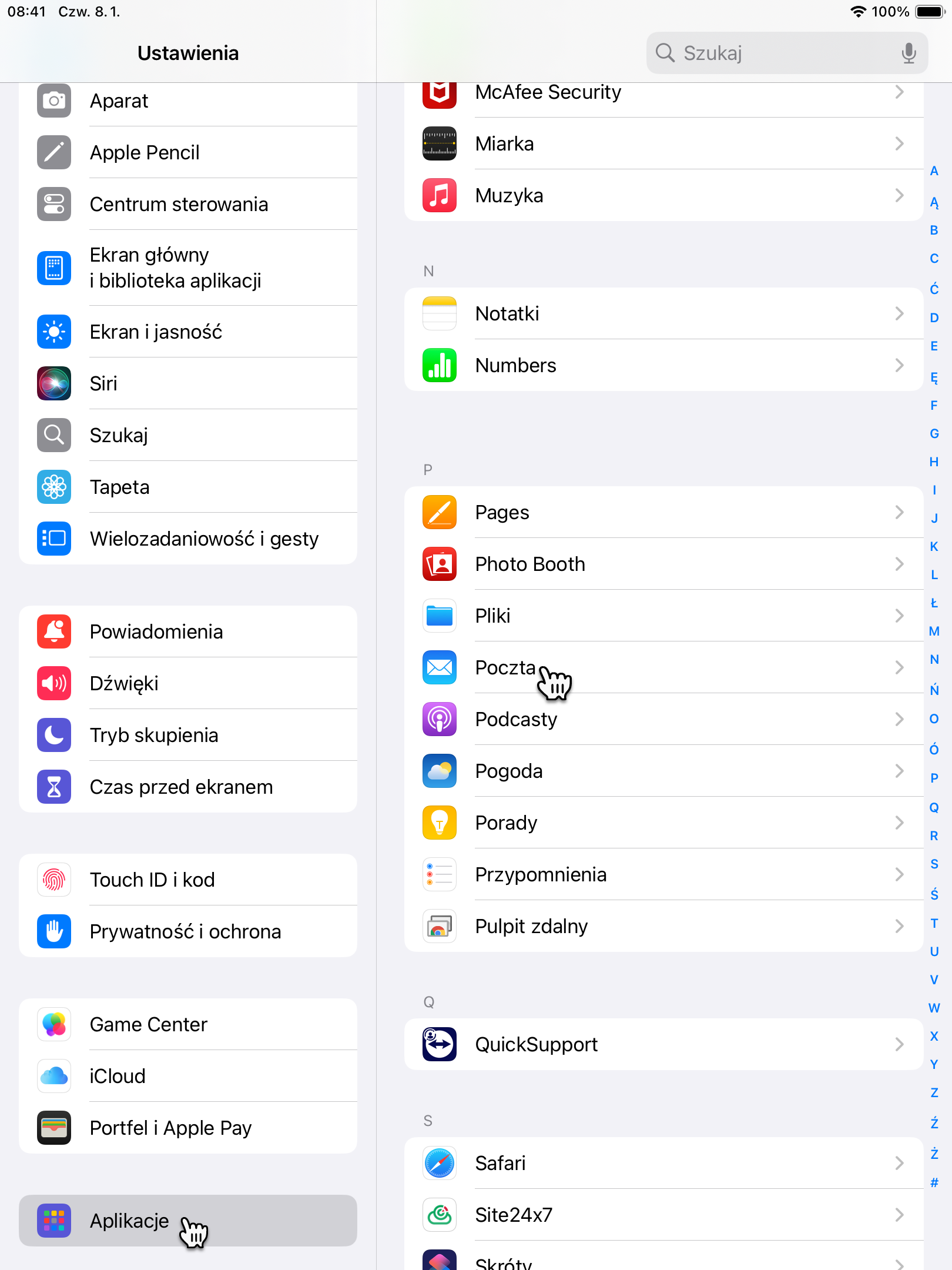 1. Na iPhonie lub iPadzie otwórz Ustawienia, przejdź do pozycji Aplikacje, a następnie wybierz aplikację Poczta.