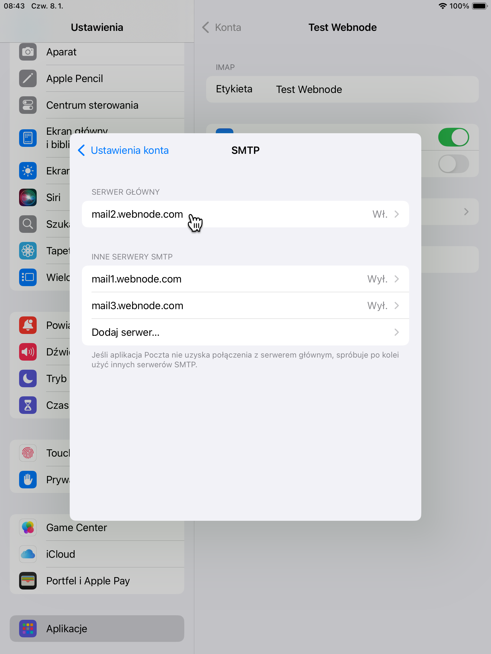 Zastąp poprzednie serwery (mail1.webnode.com, mail2.webnode.com lub mail3.webnode.com) nowymi ustawieniami: