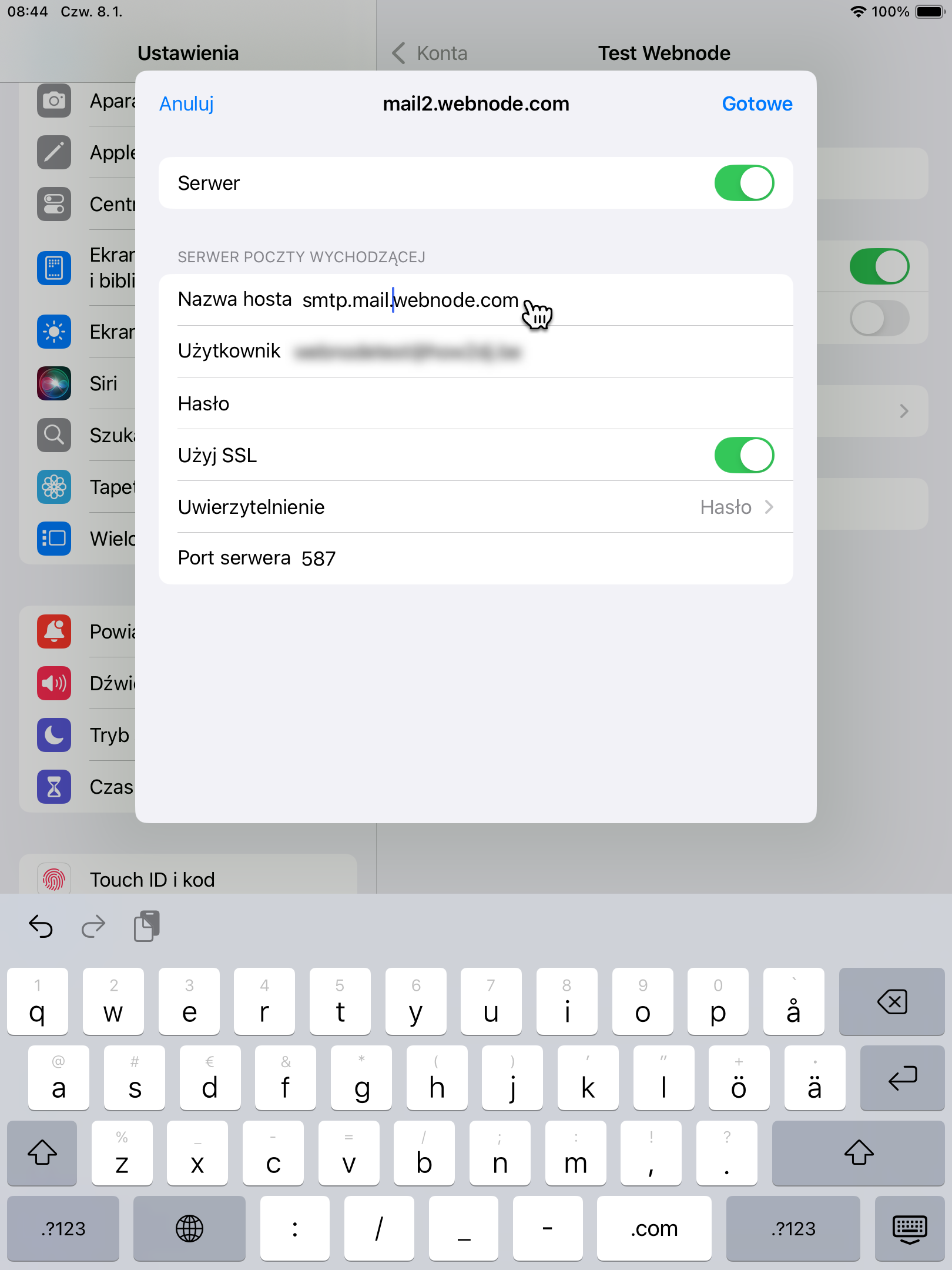 7. Zmień Nazwę hosta na smtp.mail.webnode.com, włącz Użyj SSL i ustaw Port serwera na 587. Zatwierdź ustawienia naciskając Gotowe.