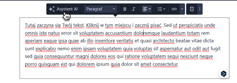 1. Zaloguj się do edytora, kliknij w wybrane pole tekstowe i wybierz opcję Asystenta AI. Informacje dotyczące tworzenia nowych tekstów z użyciem sztucznej inteligencji znajdziesz w artykule Jak stworzyć tekst z pomocą Asystenta AI.