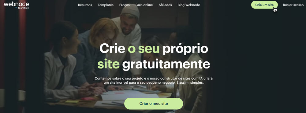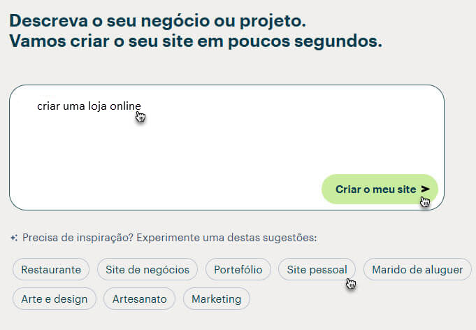 2. Descreva que tipo de site você deseja criar ou escolha uma das categorias sugeridas e clique em Criar o meu site.