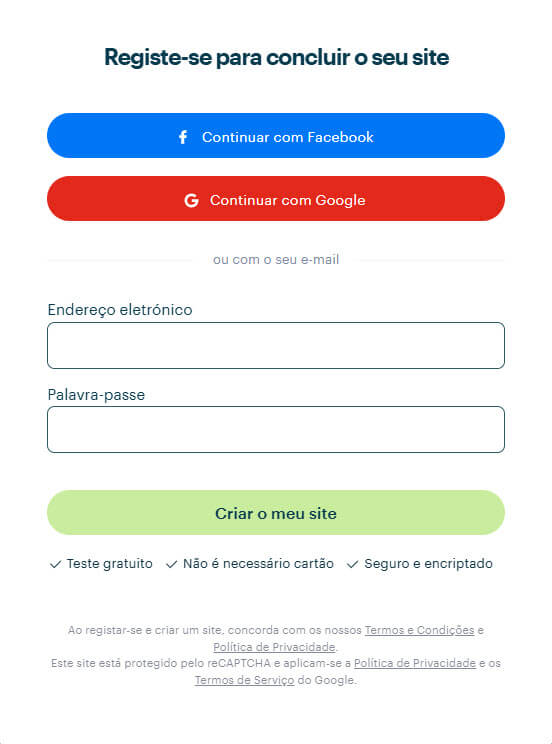 3. Cadastre-se. Se já possui uma conta conosco, insira suas informações de login. Clique no botão Crie meu site.