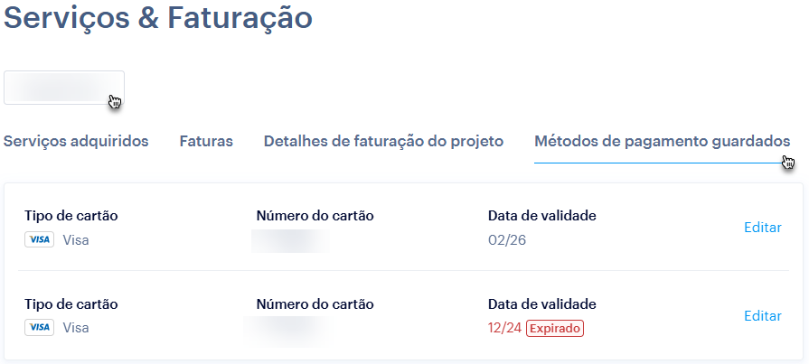 Nesta seção, o cartão aparecerá apenas uma vez, mesmo que seja usado para várias assinaturas dentro do projeto. Apenas os cartões vinculados a assinaturas ativas são exibidos. Os cartões expirados são destacados em vermelho. Qualquer cartão pode ser substituído por outro (não precisa estar expirado).