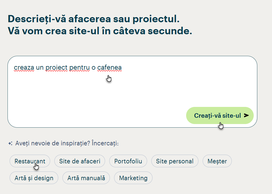 2. Descrieți ce tip de site web doriți să creați sau alegeți una dintre categoriile sugerate și faceți clic pe Creați-mi site-ul web.