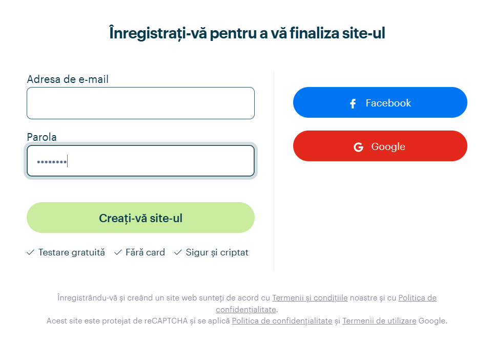 3. Înregistrați-vă contul. Dacă aveți deja un cont, introduceți datele de conectare. Faceți clic pe butonul Creați-mi site-ul web.